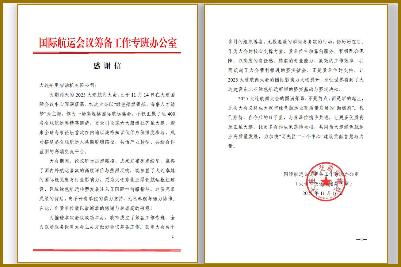 11月17日,大连船柴收到国际航运会议筹备专班办公室发来的感谢信,对公司在2025大连航商大会筹备及举办期间给予的鼎力支持、无私奉献与通力协作致以诚挚谢意,并高度肯定了公司在大会推进中的重要作用。