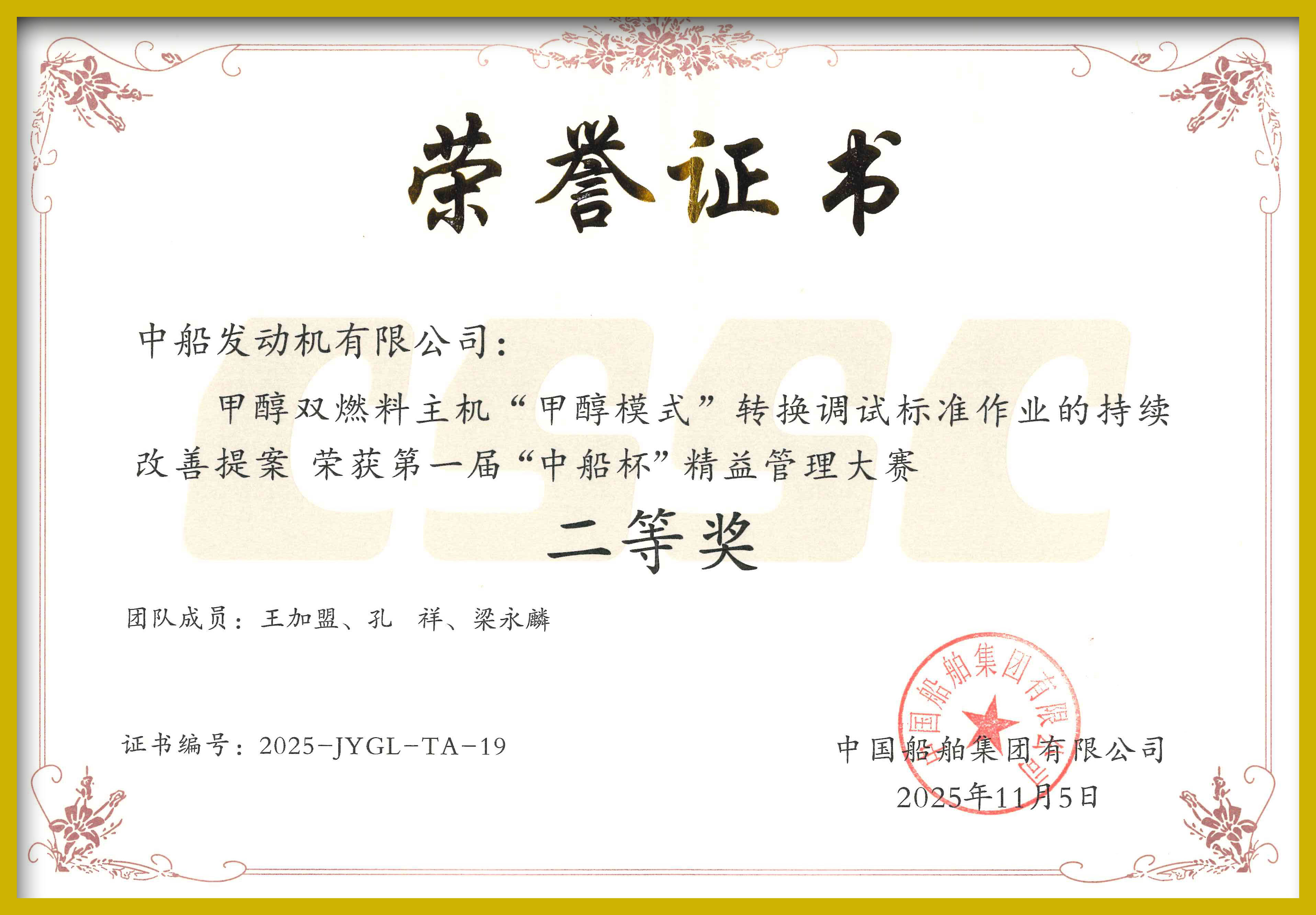 在中船集团第一届“中船杯”精益管理大赛的激烈角逐中,大连船柴总装制造部精益改善提案——《甲醇双燃料主机“甲醇模式转换”调试标准作业的持续改善》,凭借其显著的技术创新性、卓越的实践成效和可复制推广的标准化价值,从集团113项参赛提案中脱颖而出,荣获精益改善类二等奖。