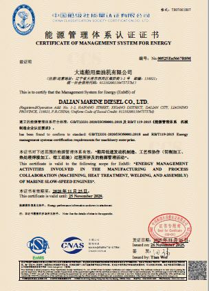 11月26日,大连船柴顺利通过中国船级社质量认证有限公司的严格审核,成功获得能源管理体系认证证书,标志着公司在能源管理、节能减排和绿色制造方面迈上新台阶。