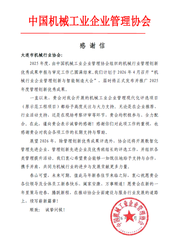 这份感谢信不仅是对我协会过去一年在机械工业企业管理现代化评选项目工作的认可,更是对双方持续深化合作的期待与鼓舞。新的一年,大连市机械行业协会将以此为动力,继续汇聚优质资源,加强跨层级沟通,进一步优化企业服务体系,携手各界同仁,共同为大连市机械行业的高质量发展贡献更大力量。